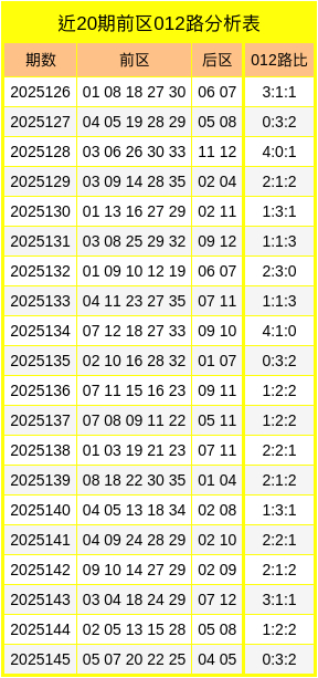 详细分析,第25146期大乐透前区012路比参考2:1:2。